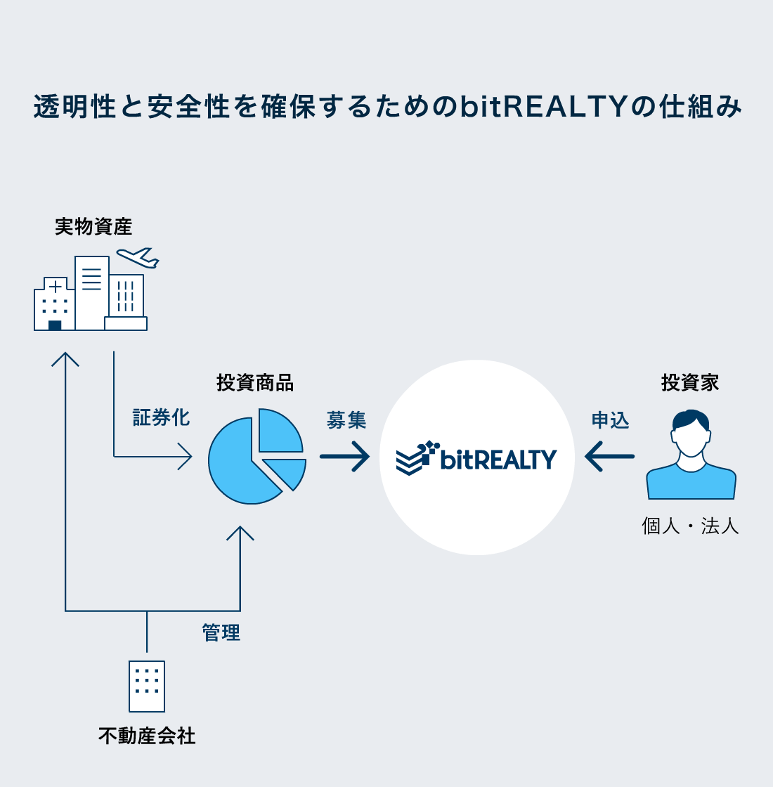 bitREALTYは、実物不動産を小口化してファンドを設立し、それらへの投資機会を多くの投資家の皆さまにインターネットを通じて提供しています。これにより、個人のお客様が非上場の不動産投資商品に直接アクセスすることができるようになりました。